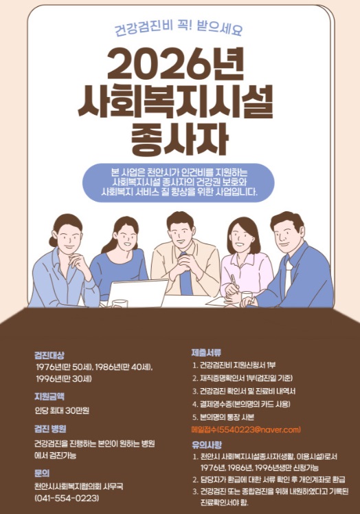2026년 사회복지시설종사자 건강검진비 지원사업 안내 페이지 정보 작성자작성자 : 천사협 조회조회수 : 16회 작성일작성일 : 26-03-03 15:54 본문 2026년 사회복지시설종사자 건강검진비 지원사업 안내드립니다. 첨부파일 건강검진비 지원 신청서2026년 최신본.hwp (20.5K) 0회 다운로드 | DATE : 2026-03-03 15:54:09 목록 다음글2026년 예산서 공고 25.12.31